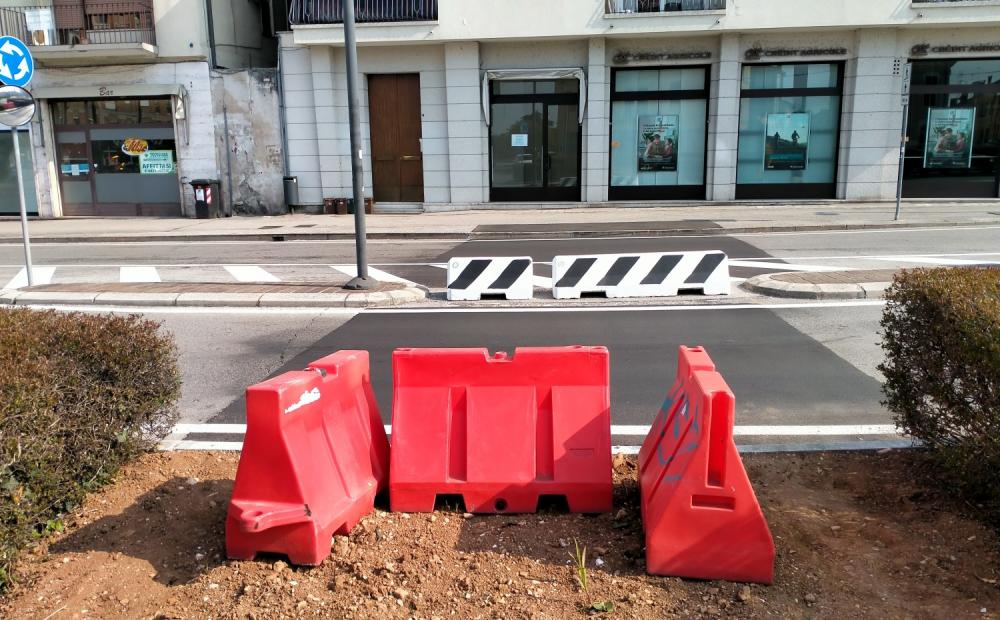 Là dove c'erano le zebre ora c'è una serie di ostacoli anti-attraversamento: un prolungamento dell'aiuola fresco di realizzazione e di semina, tre elementi di barriera New Jersey posizionati in attesa che crescano le siepi e due ulteriori cordoli in mezzo alla carreggiata stradale lanciano il chiaro messaggio “Di qui non si passa”.