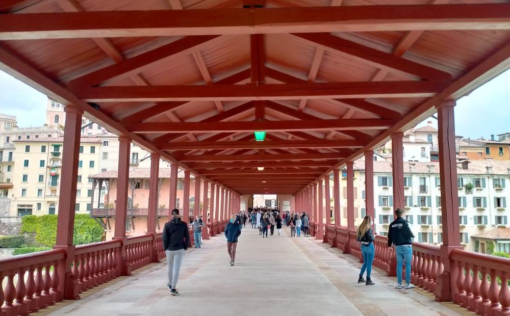 Dietro a tante mascherine, che l’aperitivo fa ovviamente abbassare, si cela anche il volto noto di Ilario Baggio, l’hair stylist-canoista che per primo, sette anni fa, lanciò l’allarme sulle precarie condizioni del Ponte pagaiando sotto le malconce stilate. Sotto la sua giacca, la maglietta di ordinanza, in predicato di diventare una reliquia: “Aiutiamo il Ponte di Bassano”. E ancora foto su foto di amministratori attuali ed amministratori precedenti, solitamente ai ferri corti per le vicende dell’attualità politica anche di questi giorni, tutti assieme in cordialità per i fotografi e i cronisti. Ma si può fare questo ed altro, per festeggiare un Amico.