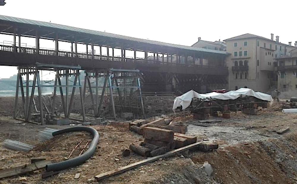 Così però, come ben sappiamo, non è stato. La trave lignea di soglia dell'architetto e ingegner Angelo Casarotti non “combaciava” con la struttura delle maxi travi reticolari in acciaio inox collocate alla base delle quattro stilate, previste dalla variante migliorativa di progetto dell'ing. Michelon. Il lungo pezzo di legno ottocentesco, come il resto delle vecchie stilate poi ricostruite in toto, è stato quindi segato via. Zac: la storica soglia non c'è più, perché ingombrante e inutile, e i suoi ceppi rimasti per qualche giorno giacenti e coperti da un telo sull'area di cantiere in asciutta del Ponte sono stati indirizzati ad un destino indefinito. Sic transit gloria mundi.