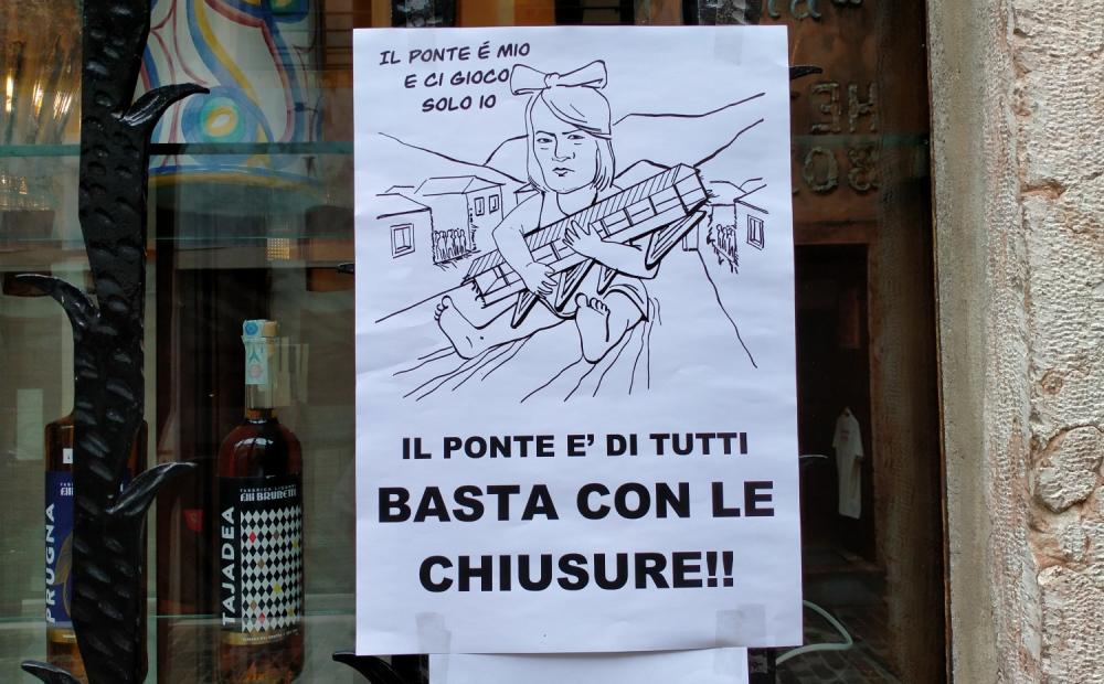 “Purtroppo - affonda il manifestino di protesta - noi del Quartiere in questi giorni offuscati dalle piogge e dall’emozione di un ritorno alla normalità, abbiamo scordato quanto poco abbia sempre contato per gli amministratori comunali la nostra voce; amministrazione che, ogniqualvolta si è ritrovata a compiere scelte che avrebbero avuto ricadute negative su questa parte della città, a malapena ha ritenuto doveroso interpellarci o condividere…”. “Succede quindi che, solo due giorni fa, veniamo bruscamente risvegliati dalla nostra benefica euforia da una chiacchiera che diffonde il racconto di una imminente chiusura del Ponte Vecchio per grandi festeggiamenti e maxi schermi nelle piazze della città.” Ulteriore giro di vite: “E il quartiere Angarano? Ci chiediamo increduli… Prima che sia troppo tardi, si organizzi la sommossa popolare e si sguinzaglino assessori comunali, non ben identificabili per le loro capacità, che vengono spediti come venditori porta a porta di enciclopedie ad informarci che beh, sì, insomma è vero, ci siamo dimenticati di avvisarvi, ma oramai la cosa è fatta e l’ordinanza di chiusura è pronta.” Il foglio è stato affisso su un paio di vetrine. Su tutti gli altri negozi aderenti alla mobilitazione spicca invece il manifesto con la Pavan che gioca col “suo” Ponte: dalla taverna alla drogheria, dalla gioielleria alla gelateria.
