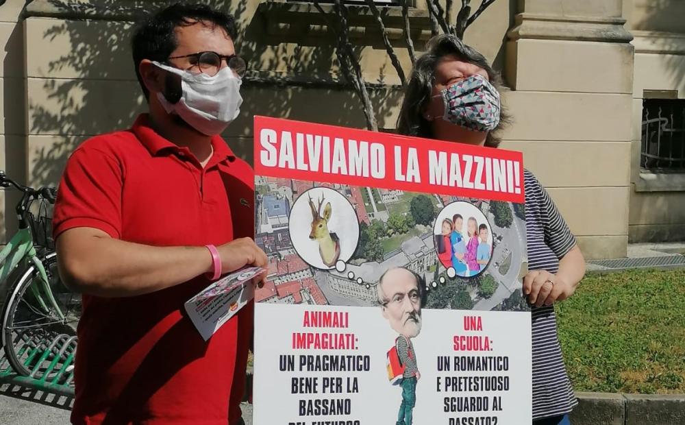 Un cartello con un Giuseppe Mazzini in tenuta da teenager, con lo zainetto sulle spalle, assorto nel dubbio amletico tra il “pragmatico bene per la Bassano del futuro” costituito dagli animali impagliati e il “romantico e pretestuoso sguardo al passato” costituito da una scuola. Non mancano certamente di ironia gli esponenti della lista civica Bassano per Tutti che questa mattina, giovedì di mercato, hanno allestito un gazebo davanti alla scuola Mazzini per sensibilizzare la cittadinanza sui destini dello storico edificio scolastico del centro storico, come dal comunicato stampa che segue: