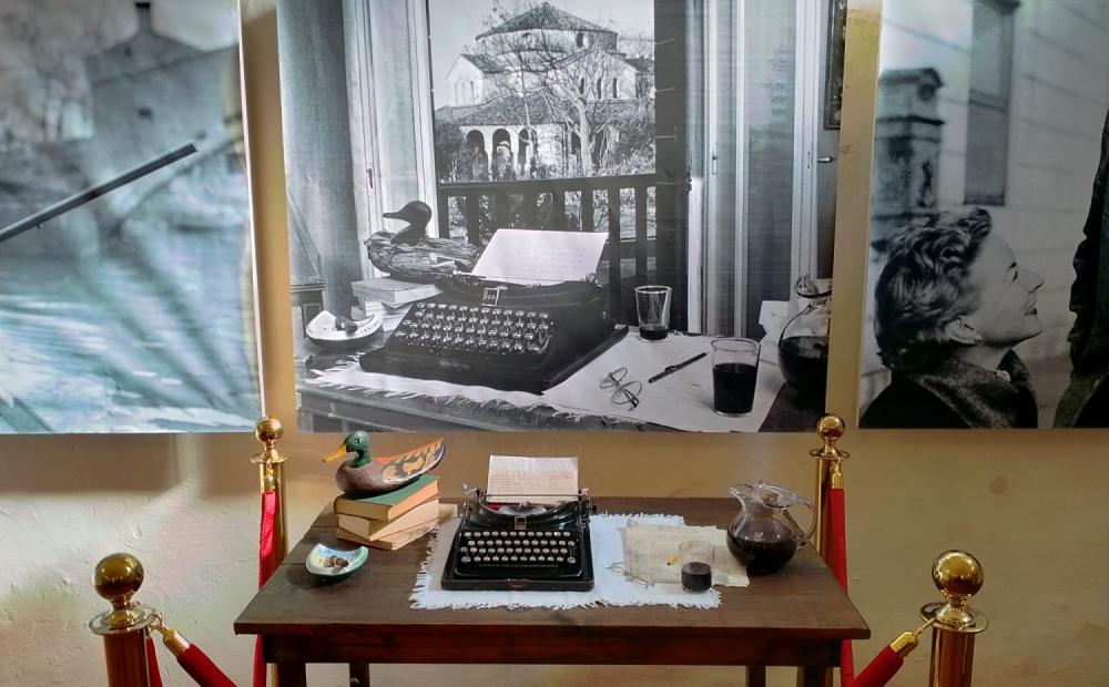 C’è una vecchia macchina da scrivere Olivetti MP1 ICO, dello stesso modello usato dal grande scrittore americano per la stesura del suo romanzo “Di là dal fiume e tra gli alberi” durante il suo soggiorno veneziano del novembre del 1948.