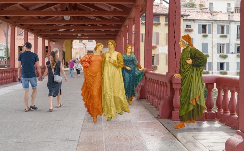 La scena fotografica di Dante che dal Ponte di Bassano si gode la visuale nobilitata dal passaggio di Beatrice, è infatti opera sua. Sartori ha estrapolato le figure dall’immagine public domain di un dipinto (“Dante e Beatrice”, di Henry Holiday), con studiata inquadratura ha quindi scattato una foto di quotidiana normalità dall’interno del Ponte e infine ha unito le due cose.