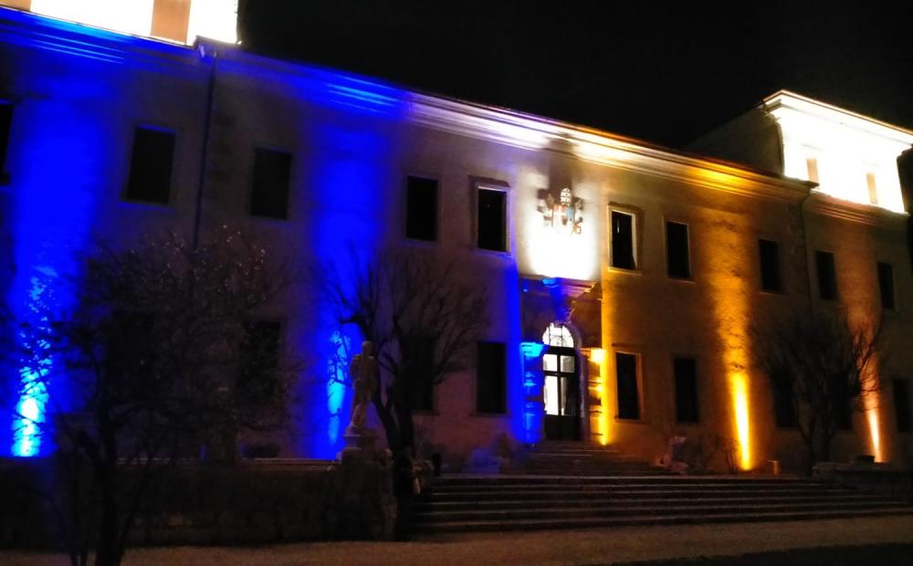 Il Blu e il Giallo. Da questa sera la facciata di Villa Rezzonico a Bassano è illuminata con i colori della bandiera dell’Ucraina. Un atto di solidarietà nei confronti del popolo ucraino coinvolto nella guerra proclamata da Putin.