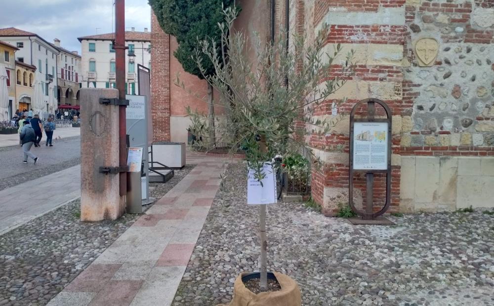 Ed è appunto l’alberello di ulivo, simbolo della pace. Sull’esile tronco della giovane essenza è stato appeso un nuovo cartello su foglio A4, con la seguente scritta: “Abbiamo rimosso il giardino temporaneo, ci scusiamo per il disagio arrecato”.