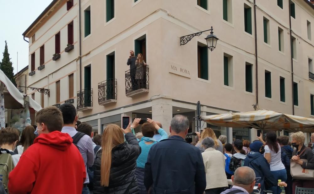 La gente è ovviamente sorpresa, si ferma, ascolta e parte la miriade di video e di foto dai telefonini. Poi l’improvvisa esibizione lirica prosegue a tappe, dalla loggia del municipio fino a giù in strada, per proseguire fino in via Roma. Qui un’altra coppia di cantanti, al primo piano del palazzo che fa angolo con la piazza, compare e canta dal balconcino messo gentilmente a disposizione dallo Studio di Architettura Remonato. Architetture della voce che si diffondono nell’aria del centro storico, per una circolazione d’arie mozartiane.