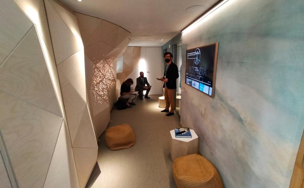Innanzitutto è stato realizzato secondo il concetto del “design biofilico”, che prende a modello la natura e in quanto tale è stato pensato “tenendo conto delle caratteristiche per cui noi stiamo bene attraverso le percezioni dei cinque sensi”. Anche il pavimento, in canapa intrecciata, ripropone le superfici non regolari di madre natura.