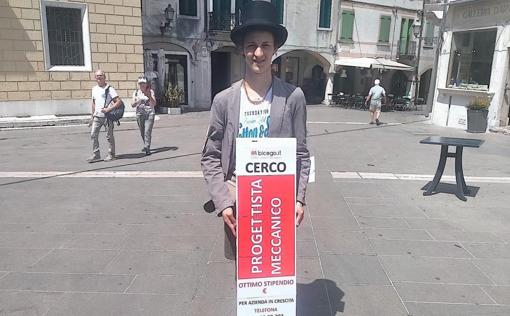 “C’è questa azienda, Bicego.it, che va in cerca delle persone per dare loro la possibilità di trovare un lavoro - mi spiega il giovanissimo “diffusore del verbo” -. Quindi io faccio il lavoro di mostrare alle persone, soprattutto durante i mercati, i lavoratori che cerchiamo, come in questo caso il progettista meccanico, oppure il tornitore o quant’altro.”
