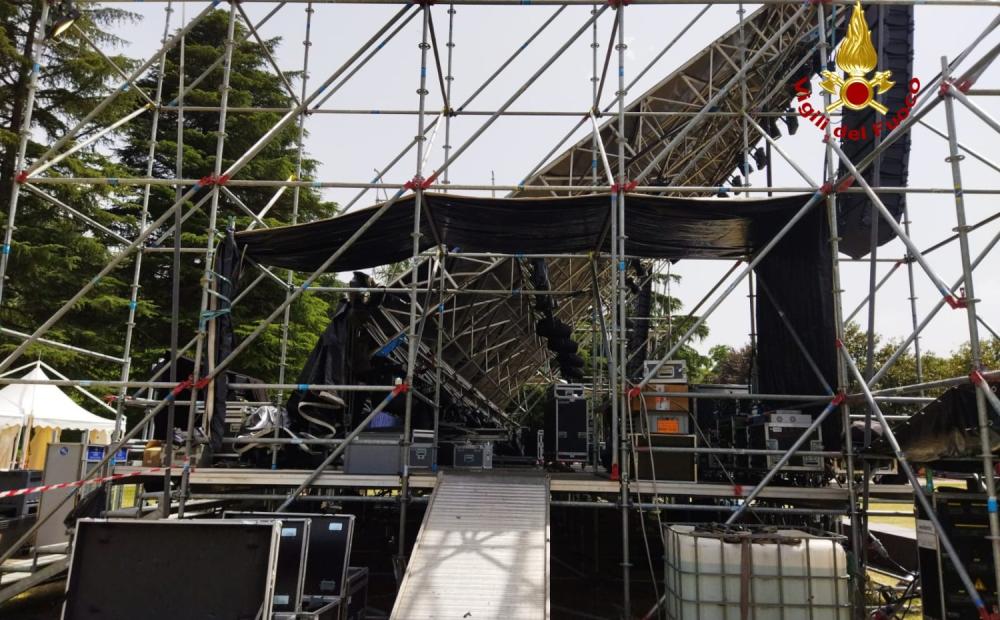 Mentre erano in corso i lavori di allestimento del palcoscenico per il concerto di Elisa “Back to the Future”, programmato per domani sera martedì 28 giugno, la tettoia del palco già montata si è improvvisamente piegata a 45 gradi, crollando sulla base del palco stesso.