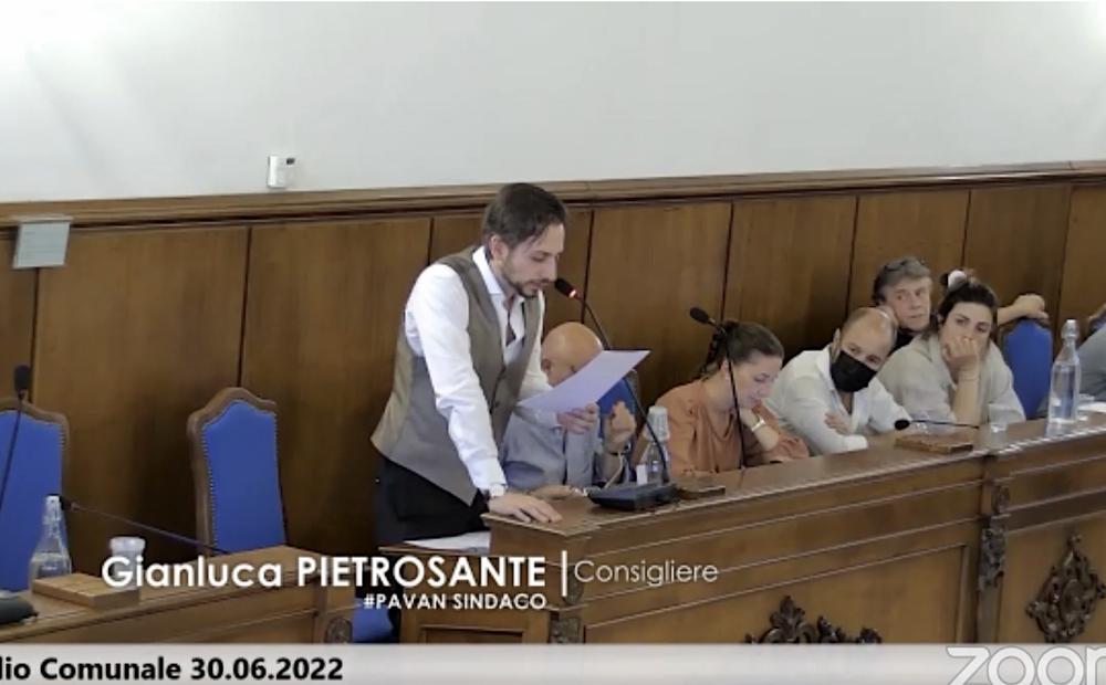 Gianluca Pietrosante durante l’ultimo consiglio comunale (fermo-immagine dalla registrazione video disponibile nel sito del Comune di Bassano del Grappa)