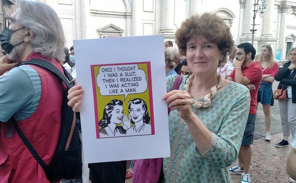 Tra questi l’ex assessore comunale Cristina Busnelli che regge un cartello con la riproduzione del fumetto di una donna che dice a un’altra in inglese: “Pensavo di essere una sgualdrina, poi mi sono resa conto che mi comportavo come un uomo”.