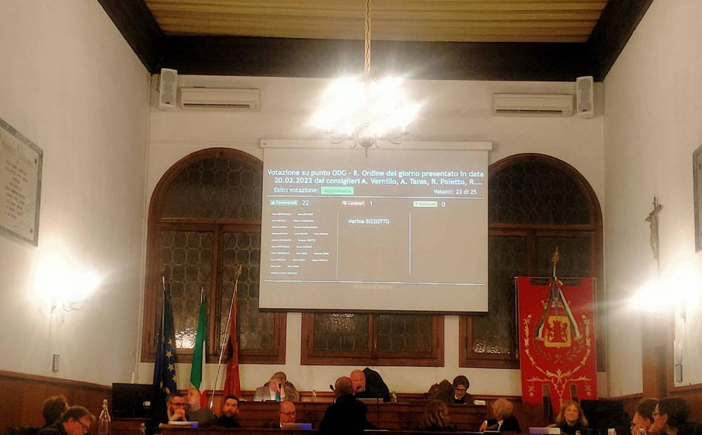 Finalmente, quindi, si vota. L’Ordine del Giorno emendato viene approvato con 22 voti favorevoli (13 consiglieri di maggioranza e i 9 consiglieri di opposizione) e un solo voto contrario, quello di Marina Bizzotto.