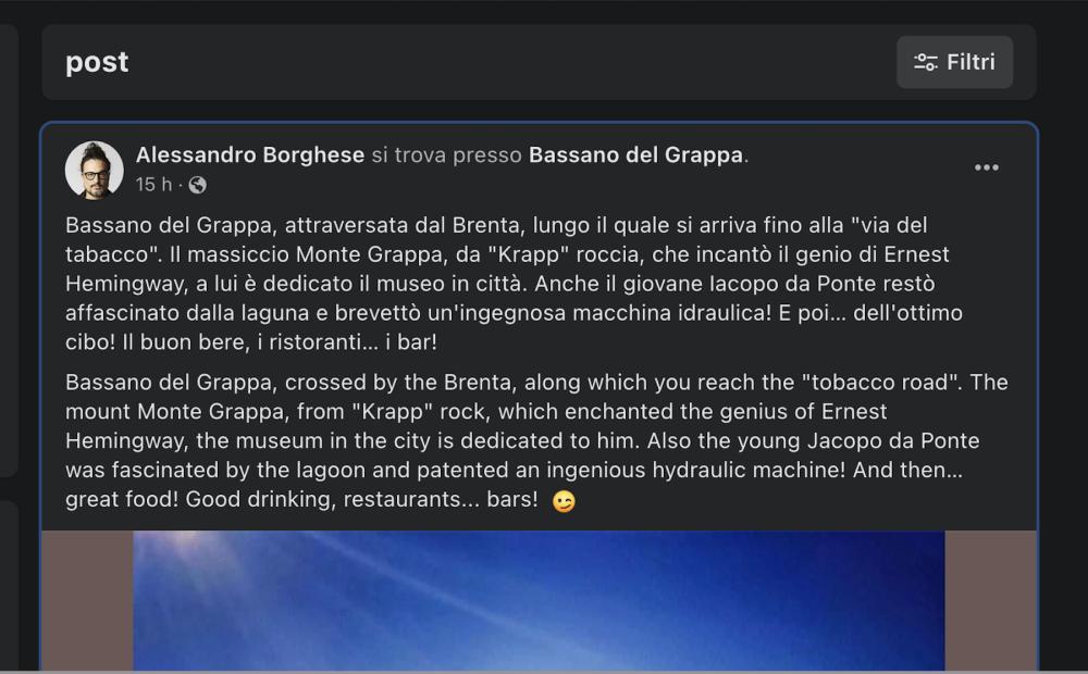 “Bassano del Grappa - si legge nel post -, attraversata dal Brenta, lungo il quale si arriva fino alla "via del tabacco". Il massiccio Monte Grappa, da "Krapp" roccia, che incantò il genio di Ernest Hemingway, a lui è dedicato il museo in città.”