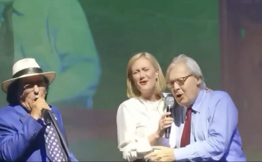 L’inedito trio, a sentire l’audio del video, sembra anche intonato. Mi riferisco alla sindaca e a Sgarbi, visto che la capacità canora di Al Bano, che comunque copre inevitabilmente le voci degli altri due, è fuori classifica. Ma Vittorio Power ci mette del suo da vero animale da palcoscenico, gesticolando alla fine come una rockstar, e la sindaca è un festival a sé stante di espressioni del viso tra l’entusiasta e l’estasiato.