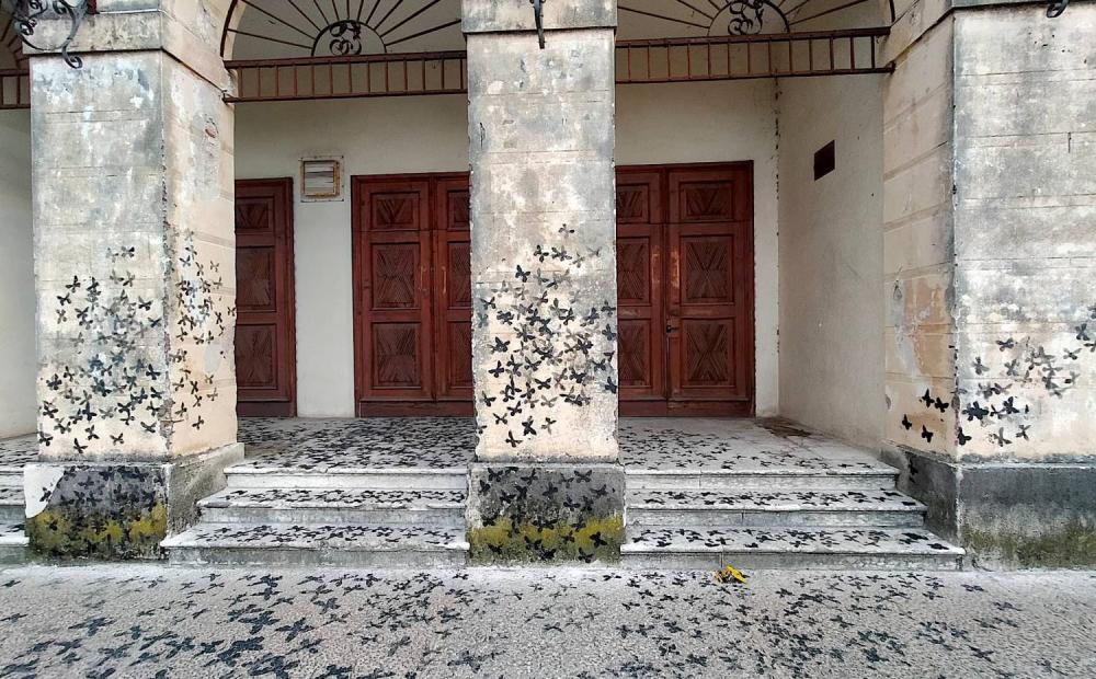 E, quasi simbolicamente, sono stati ricoperti di farfalle nere sia elementi di proprietà privata (pareti, colonne, scalini e pavimento esterno dell’atrio) che di proprietà comunale (marciapiede e strada).