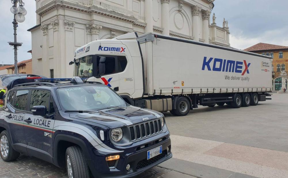La pattuglia ha scortato il Tir facendolo proseguire per piazza Garibaldi e contromano in via Museo, bloccando il traffico per consentire al gigante della strada di raggiungere piazzale Trento e quindi la via della libertà, quella vera, di discesa Brocchi e viale XI Febbraio per proseguire il suo viaggio verso Ca’ Cornaro e portare a termine la sua consegna.