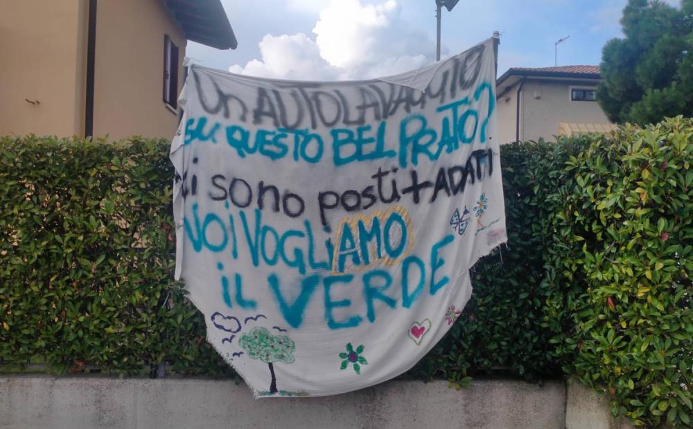 “Un autolavaggio su questo bel prato? Ci sono posti + adatti. Noi vogliamo il verde”, sta scritto su uno striscione, che vedete immortalato nella foto pubblicata sopra, affisso sulla siepe di un’abitazione dirimpettaia all’area di intervento.
