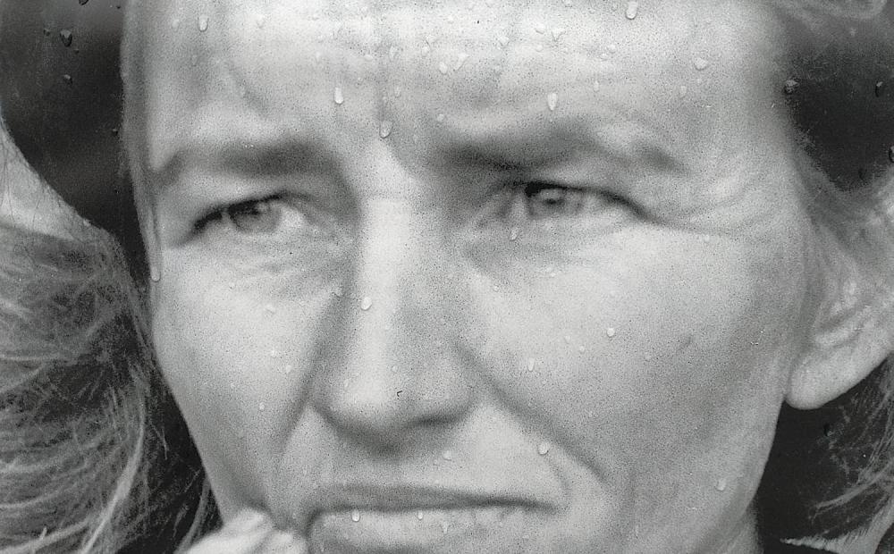 Particolare della foto del manifesto della Migrant Mother di Dorothea Lange con le gocce di pioggia (foto Alessandro Tich)