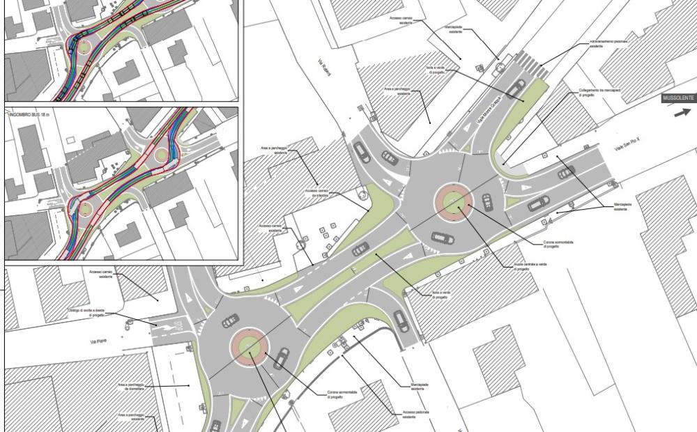 In sintesi, la soluzione viaria prevede una prima rotatoria all’altezza del palazzo “ex Gazzettino” - dove su viale Venezia confluiscono via Piave, via dei Mille e anche la strada di accesso carraio allo Stadio Mercante - e una seconda rotatoria pochi metri più in là, al vero e proprio incrocio di viale Venezia con viale Pio X, via Roberti e viale Monte Grappa.