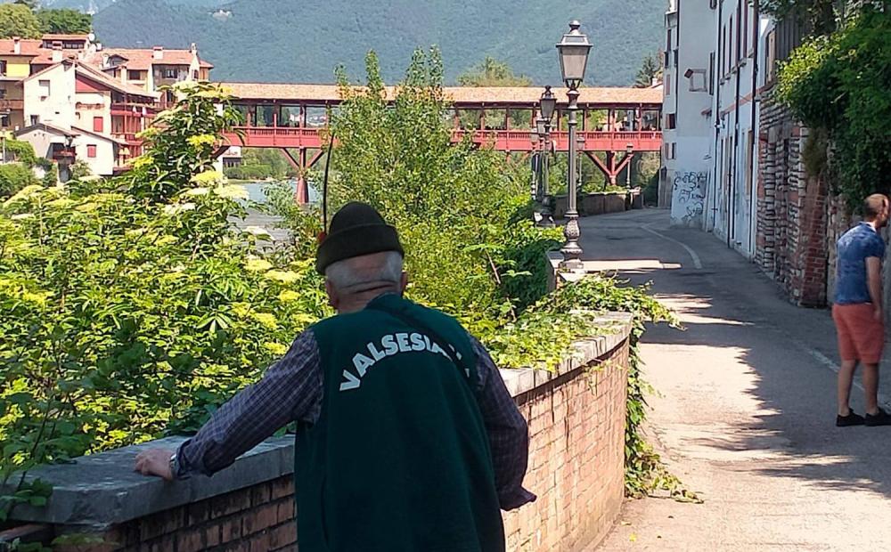 Riesco anche a scattargli una foto di spalle e non è difficile perché quel Vecio Alpin non si muove. Rimane lì, senza neanche cambiare posizione, a godersi quel panorama anche se il Ponte dalla sua visuale è parzialmente coperto da una pianta.