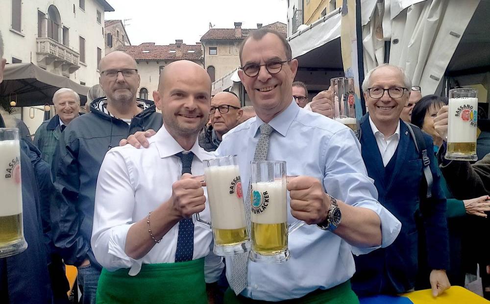 In un colpo solo il biondo nettare germanico fa uscire il suo primo fiotto dalla spina della botte, dimostrando la dimestichezza del primo cittadino bassanese nel cimentarsi nel ruolo di mastro birraio.