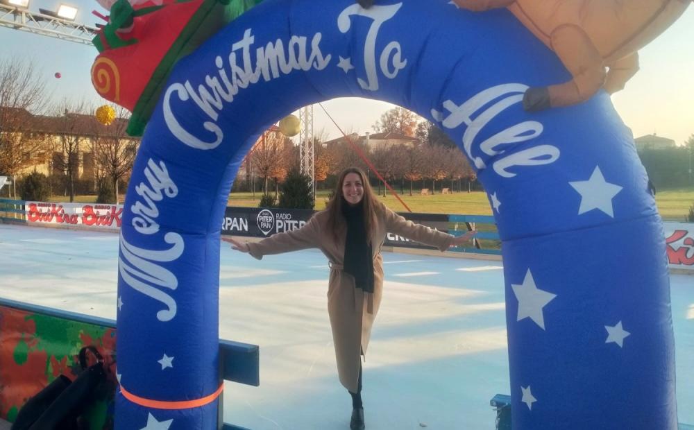 L’assessore Pontarollo oltrepassa l’arco gonfiabile d’ingresso della pista, mette ufficialmente i piedi sulla superficie ghiacciata anche se senza pattini, si gira verso il mio telefonino, allarga le braccia e simula sorridendo una figura da pattinatrice artistica su ghiaccio.