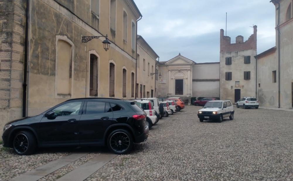 Quello che ho visto lo vedete anche voi nella foto che ho scattato e che è pubblicata sotto: la solita fila di automobili recentemente “autorizzate” alla sosta h24 tutti i giorni dell’anno nell’ampio spiazzo interno alle mura altresì noto come piazza Castello, parcheggiate una di fianco all’altra e non solo, una delle quali (vettura di servizio del Comune) beccata proprio in fase di partenza.