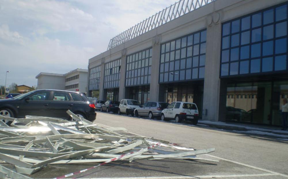 Le lamiere del cornicione dei Metropolis Cinemas abbattute dal nubifragio di mercoledì