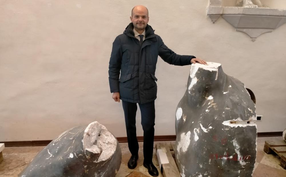 Il sindaco Nicola Finco tra due pezzi del Cavallo Colossale di Antonio Canova (foto Alessandro Tich)