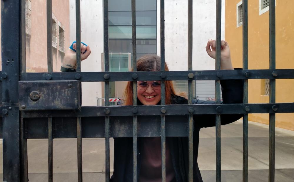 Ne è venuta così fuori, in modo del tutto naturale, la simpatica e insolita foto che vedete pubblicata sopra: lei dietro alle sbarre del cancello chiuso, e peraltro davanti al Tribunale, quasi a voler simboleggiare il suo status di “prigioniera” dei problemi da risolvere nei plessi scolastici di Bassano.