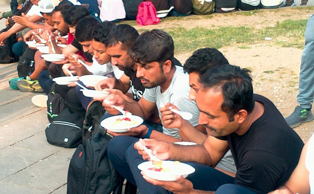 Nel frattempo, il gruppo di “Solidarietà Migranti Bassano” ha cominciato a distribuire i piatti: per tutti i commensali arrivati da lontano, è finalmente ora di cena.