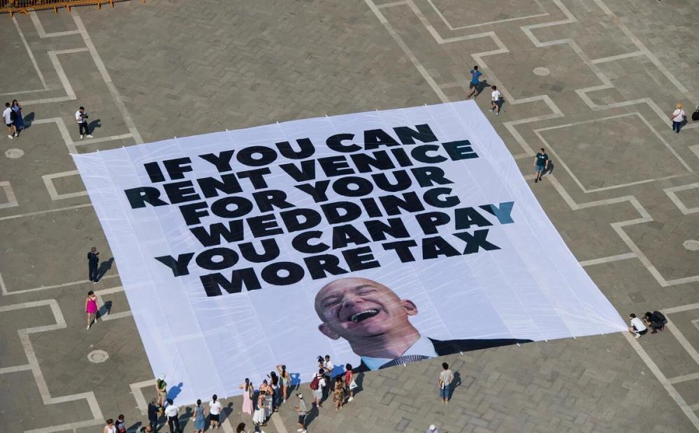 È di ieri il flash mob compiuto in piazza San Marco da attivisti di Greenpeace Italia, assieme al gruppo d’azione britannico “Everyone Hates Elon” (“Tutti Odiano Elon”, che ovviamente è Musk), che hanno srotolato uno striscione gigante di 400 metri quadrati con la caricatura di Bezos e con la scritta in inglese “Se puoi prendere in affitto Venezia per il tuo matrimonio, puoi pagare più tasse”.