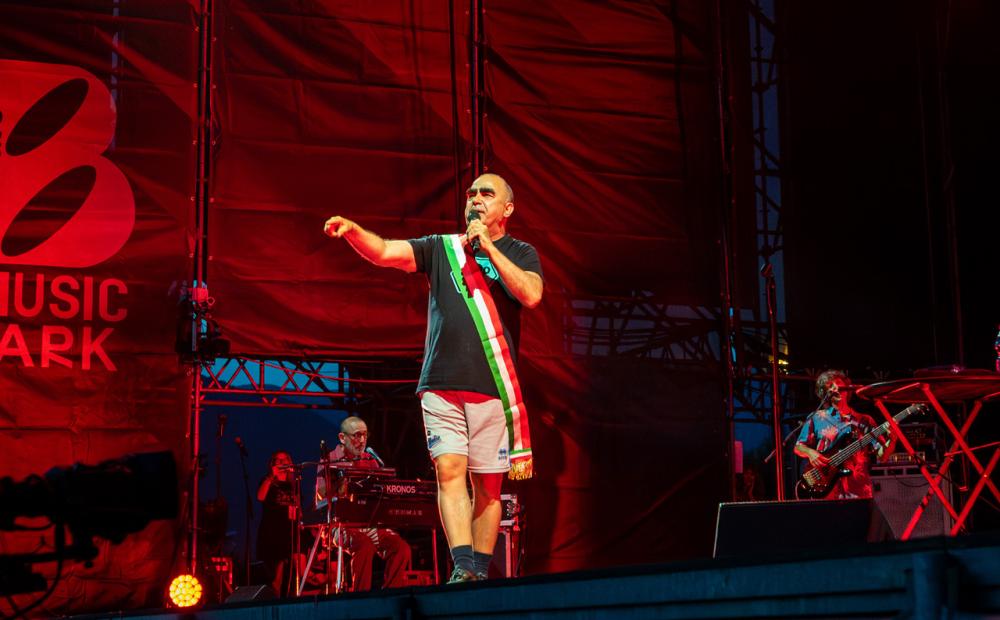 Nicola Ignazio Elio, sindaco di Bassano per una notte, compare sul palcoscenico del Bassano Music Park con la fascia tricolore, per il taglio del nastro del Concertozzo 2025 di Elio e le Storie Tese affidato alla madrina ovvero madrinozza dell’evento Geppi Cucciari.