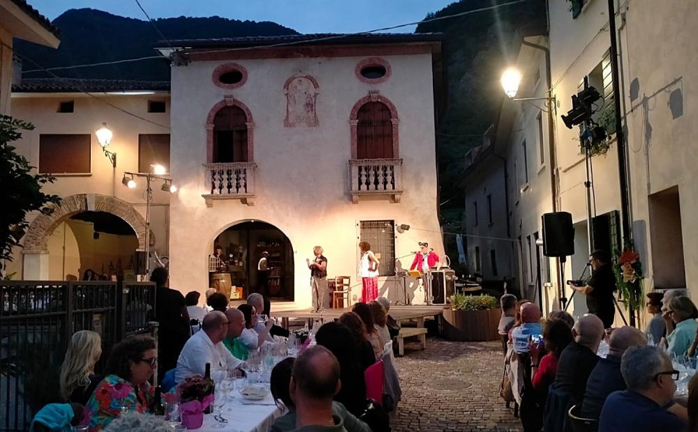 Terminata la cena spettacolo, alcuni capannelli di commensali si attardano a conversare piacevolmente nel pittoresco borgo che per una sera è stato trasformato in teatro di strada, fino a quando il campanile di Solagna non batte l’ora felice, ma da coprifuoco, della mezzanotte.