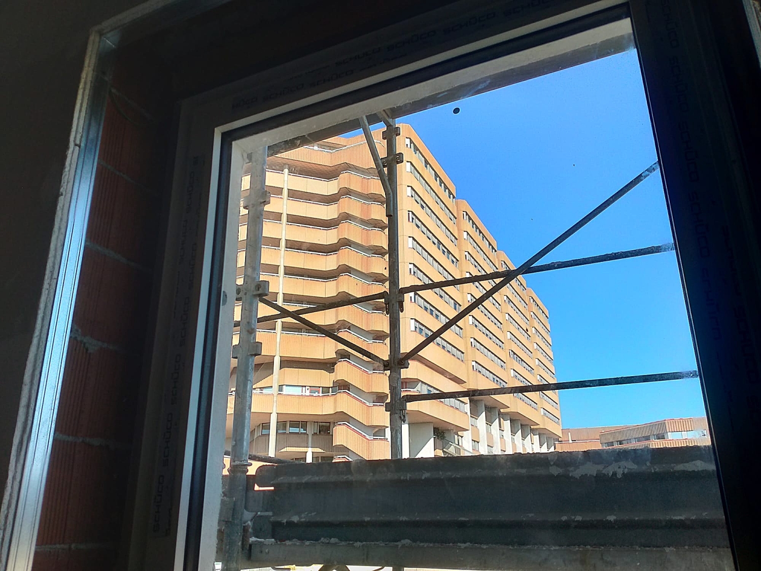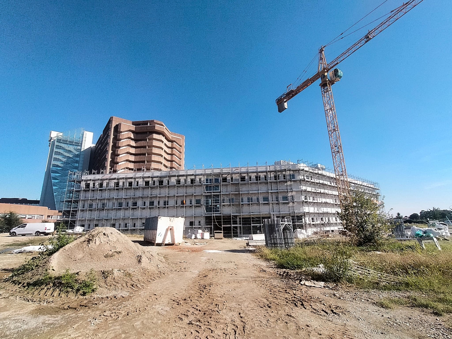 La Casa della Comunità, che sta sorgendo ad ovest del San Bassiano, è un edificio davvero imponente. Per riuscire a fotografarlo tutto dall’esterno, devo usare il grandangolo del telefonino oppure scattare una foto “aerea” dall’11° piano dell’Ospedale (dove si sta realizzando l’Ospedale di Comunità, di cui mi occuperò più avanti).