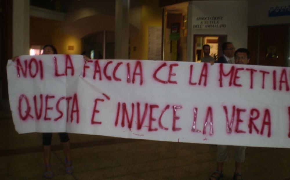 i manifestanti con lo striscione nell'androne d'ingresso del San Bassiano