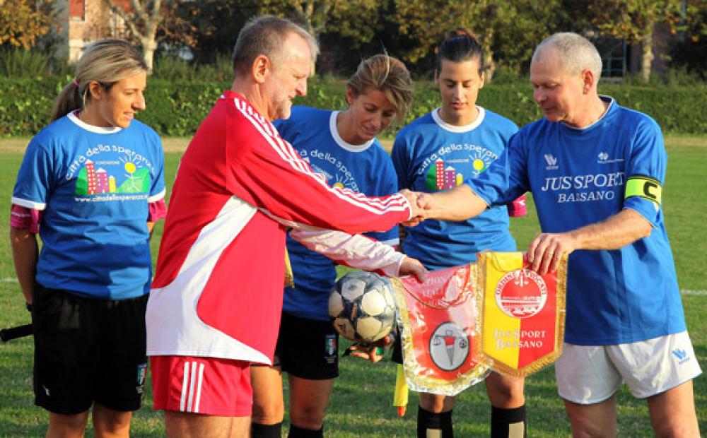 1 a 1 palla al Centro, questo il risultato maturato sabato 7 novembre allo stadio Giusti di Bassano del Grappa per l'impegnativa partita che ancora una volta ha visto affrontarsi sul campo di gara le formazioni del "Jus Sport Bassano" e della Nazionale Italiana Magistrati. Un 'appuntamento sportivo ma soprattutto dedicato alla solidarietà con la raccolta fondi a favore dell'Associazione Citta della Speranza di Padova.