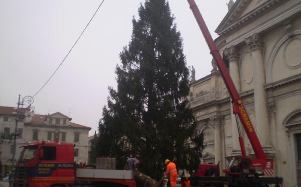 L'imponente pianta proviene dai boschi della Piana della Marcesina, in comune di Enego, dove questa mattina è stata tagliata dai tecnici del magazzino comunale di Bassano.