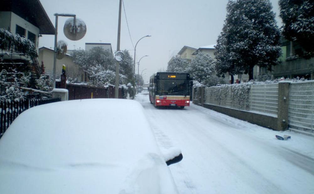 Ore 13: Via Gerola a Bassano totalmente ammantata di neve, e l'autobus per Cartigliano transita sulla "strada bianca"