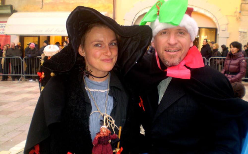 Una delle tante Befane e un "magico aiutante" alla "Festa della Befana" in piazza a Bassano