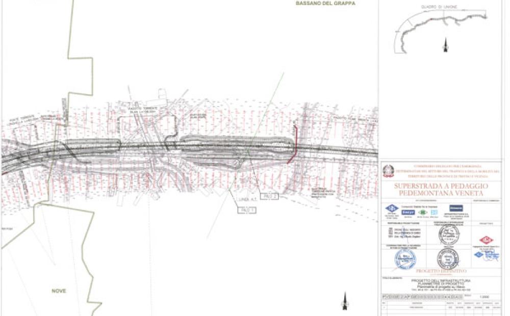 Una planimetria della Superstrada Pedemontana Veneta nel tratto di tracciato che interessa Bassano