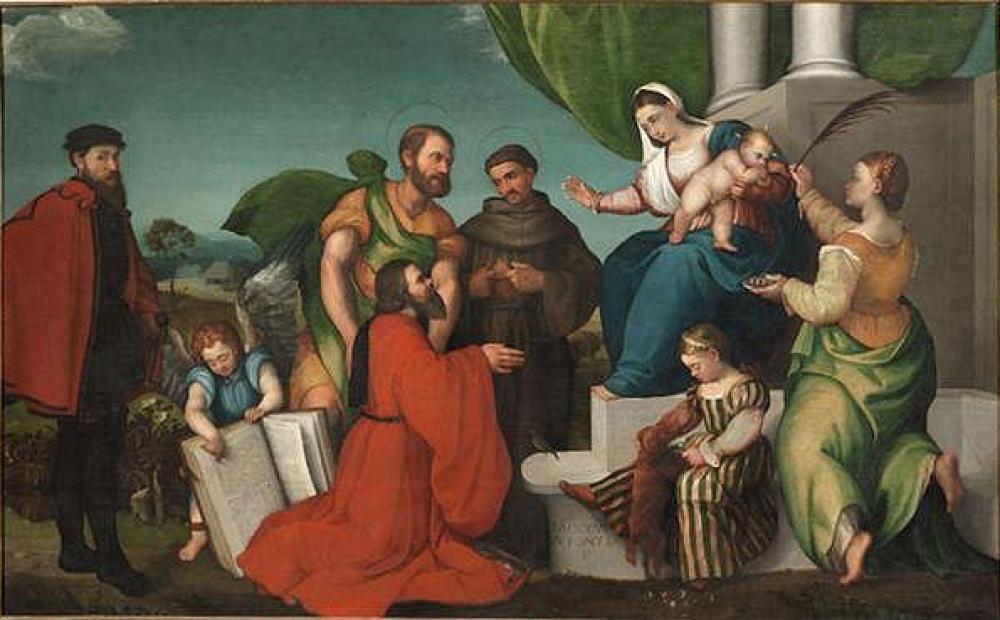 Jacopo Bassano, "Madonna in trono col Bambino tra i Santi Lucia, Francesco e Matteo e il Podestà Matteo Soranzo con la figlia Lucia e il fratello Francesco", 1536 olio su tela