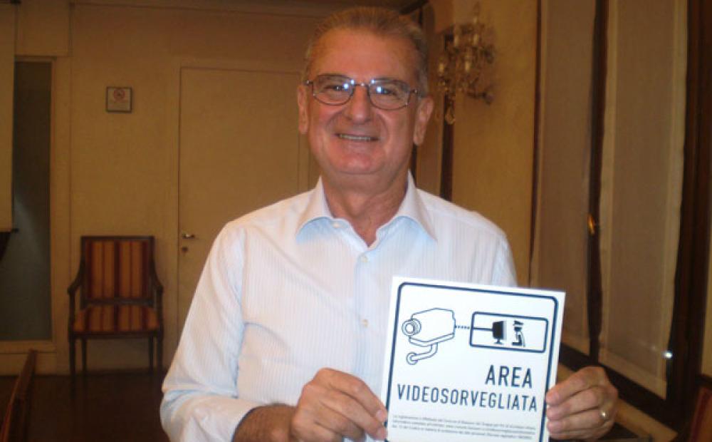 L'assessore Dino Boesso con il nuovo cartello del progetto videosorveglianza