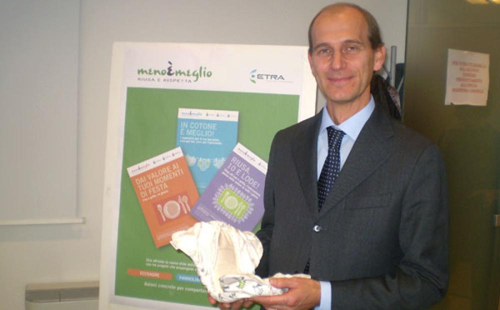 Il presidente di Etra Stefano Svegliado con un pannolino lavabile, oggetto di una delle tre campagne del progetto "Meno è meglio"