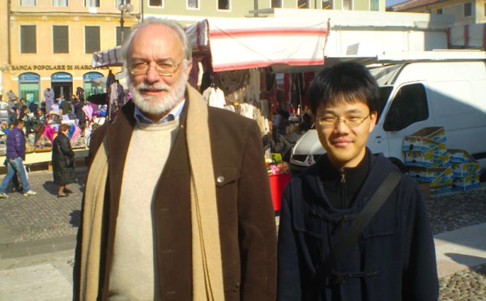 Il presidente degli "Amici di Merlin Cocai" Otello Fabris con il laureando giapponese Inada Kei