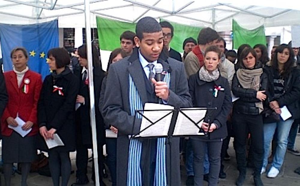 “Essere italiani - ha affermato ancora lo studente - è una parola e un valore importante. Vogliamo dare voce ai pensieri delle persone che hanno fatto l'Italia e che non erano tanto più grandi di noi. Uno di loro ha detto: “Io sono nato veneziano e per grazia di Dio morirò italiano”. Era Ippolito Nievo. E io voglio dire che sono nato italiano, e morirò italiano.”