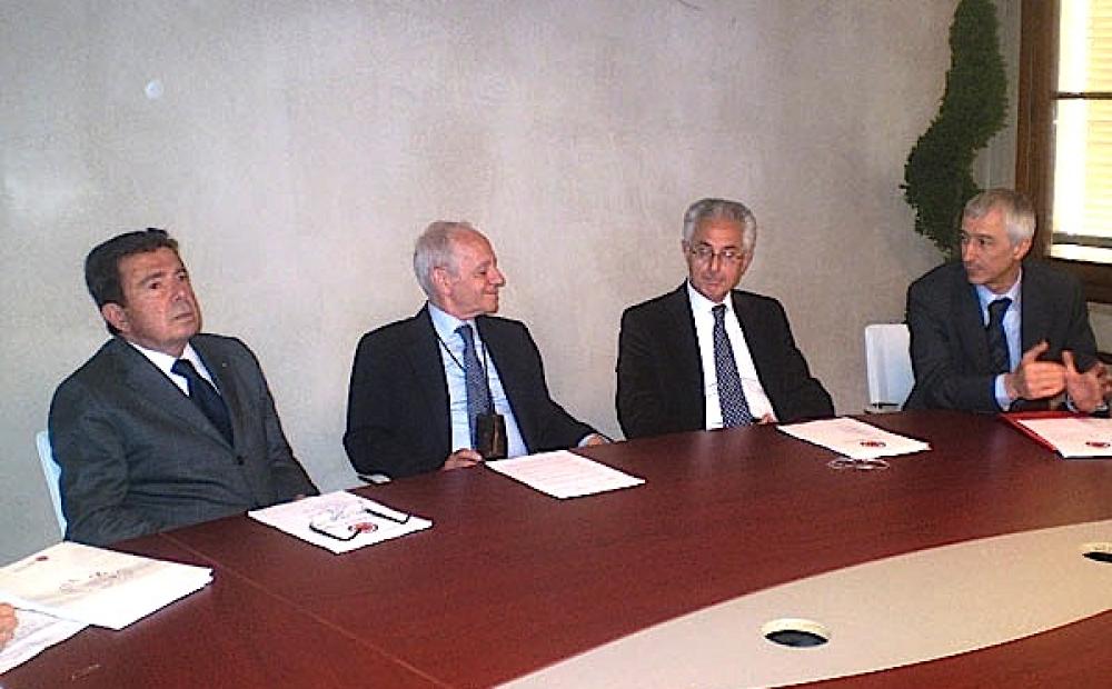 Il sindaco Stefano Cimatti, il presidente della Camera di Commercio Vittorio Mincato, il presidente del Tribunale di Bassano Aurelio Gatto e il presidente dell'Ordine degli Avvocati di Bassano Francesco Savio alla presentazione del nuovo organismo