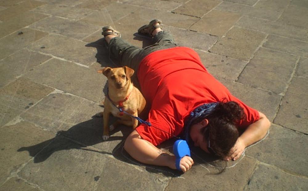 Terminata l'azione a sorpresa, documentata nella nostra photogallery, ciascun attivista ha firmato il suo nome con un gessetto all'interno della sagoma del proprio corpo disegnata sul selciato.