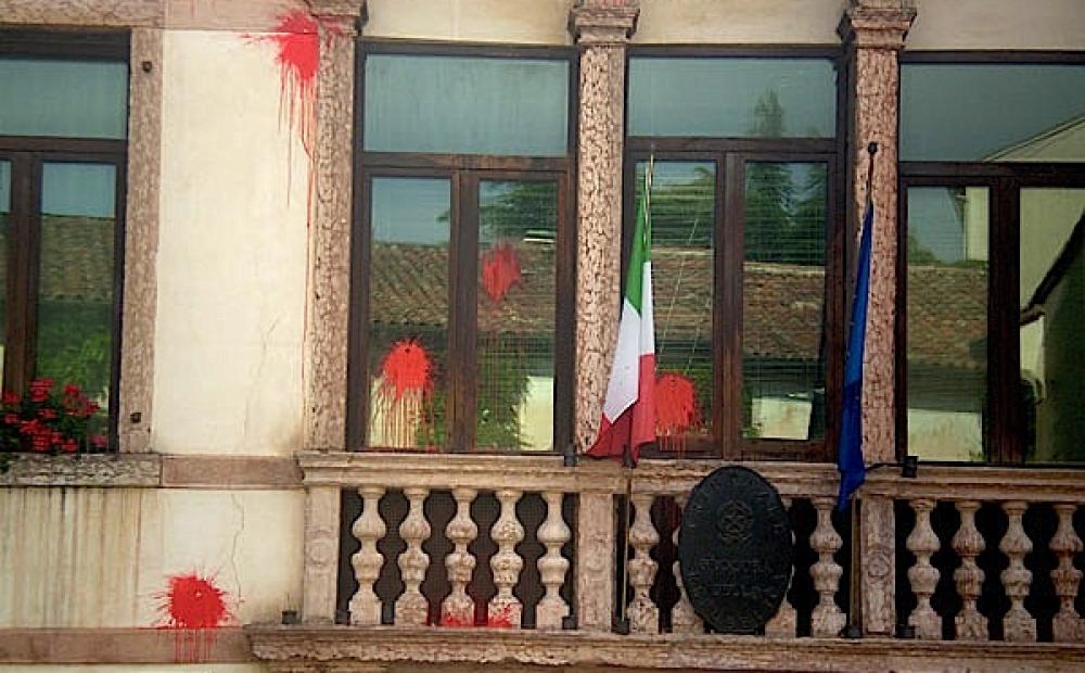 Una decina di macchie rosse sulle finestre e sulla facciata del Tribunale di Bassano in via Marinali.
