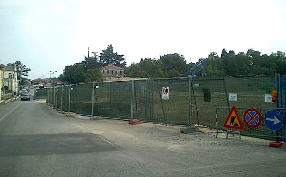 Via De Blasi con le transenne del lato est del cantiere dell'area del Vecchio Ospedale di Bassano